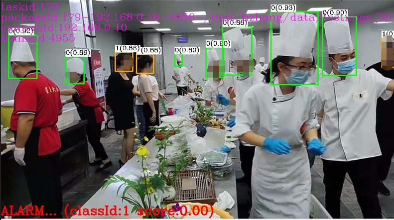廚師帽識別算法是指在明廚亮灶場景下,識別未戴廚師帽的人,輸出報警信息。