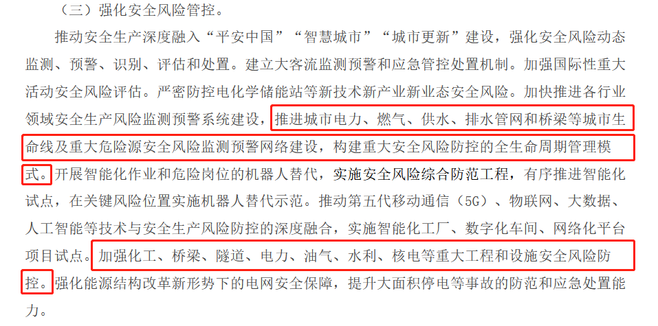 根據(jù)《十四五國家安全生產(chǎn)規(guī)劃》中提出,推動安全生產(chǎn)深度融入“平安中國”“智慧城市”“城市更新”建設,強化安全風險動態(tài)監(jiān)測、預警、識別、評估和處置。推進城市電力、燃氣、供水、排水管網(wǎng)和橋梁等城市生命線及重大危險源安全風險監(jiān)測預警網(wǎng)絡建設,構(gòu)建重大安全風險防控的全生命周期管理模式。