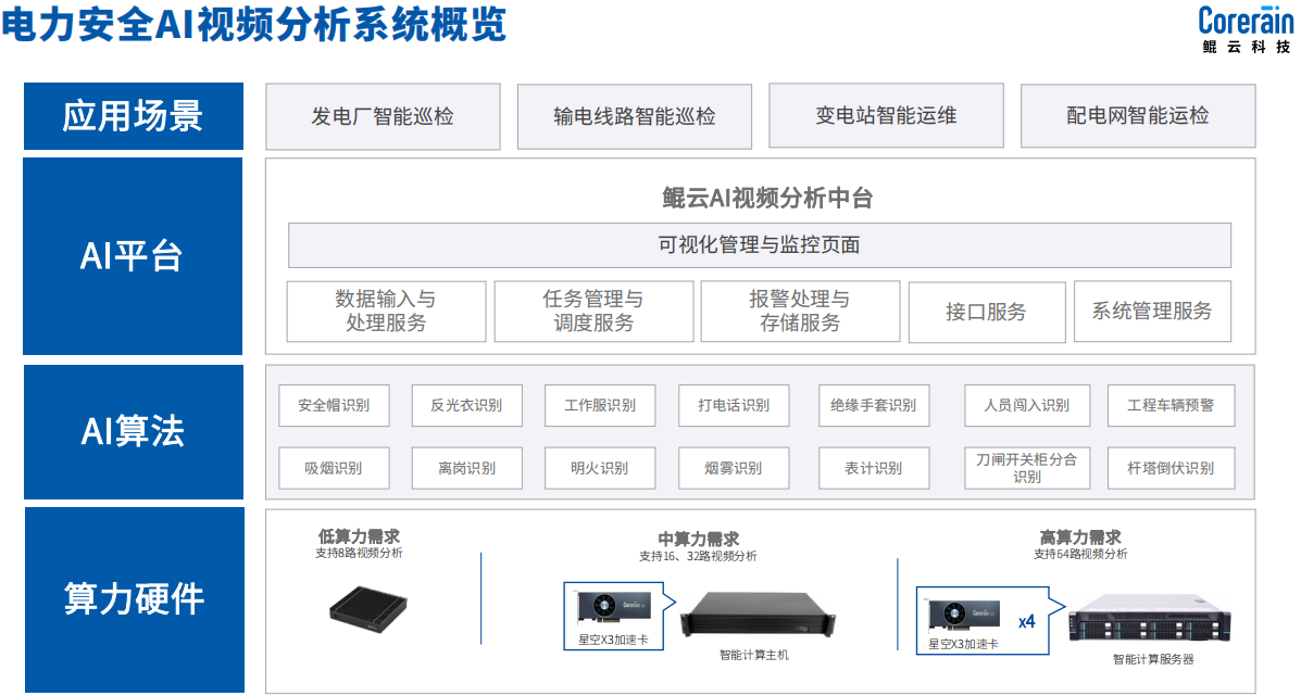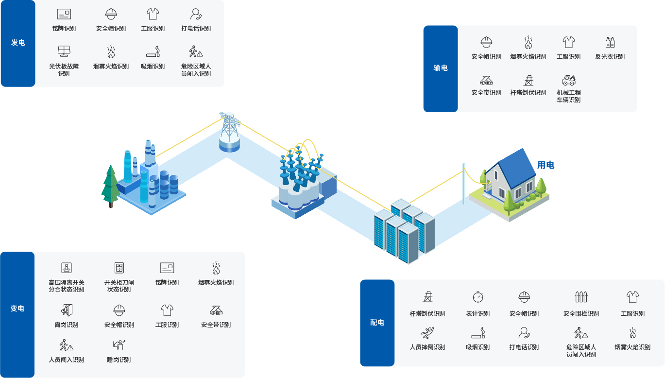 智慧電力解決方案的實施,將使電力行業(yè)進入一個嶄新的發(fā)展階段。在發(fā)電、輸電、變電、配電不同類型的電力場景下,鯤云科技提供了對應的AI智能分析解決方案,通過部署多種AI算法,利用Ai分析技術對現(xiàn)場實時識別,發(fā)現(xiàn)風險隱患及時報警,并在終端顯示記錄詳情,杜絕因人工監(jiān)管疏忽和作工操作不當,以及因涉及面廣信息不同步產(chǎn)生的信息孤島,傳統(tǒng)安防無法及時反饋造成安全事故。