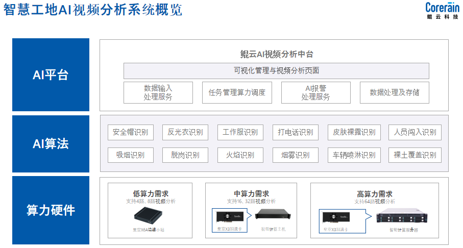 為滿足建筑工地的安全監(jiān)管要求,鯤云科技提供了智慧工地ai風(fēng)險識別預(yù)警系統(tǒng)。在充分利舊的原則上,通過企業(yè)原有的攝像頭接入部署多種AI算法的AI視頻分析盒子,聯(lián)通終端后臺管理中心形成一套完整的AI視頻分析系統(tǒng)。通過智能視頻分析,對未佩戴安全帽識別、未穿反光衣識別、煙霧火焰識別、人員闖入識別等違規(guī)現(xiàn)象實時識別報警。