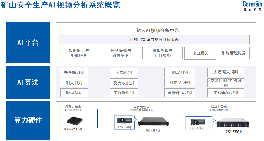 礦山安全事故處于高發(fā)態(tài)勢,智慧礦山的建設(shè)需要充分考慮現(xiàn)代信息技術(shù)的應(yīng)用,對照各地區(qū)政策對智慧礦山建設(shè)的要求,作為技術(shù)領(lǐng)先的AI算力和視頻分析服務(wù)商,鯤云科技提供深入行業(yè)場景的算法、自主研發(fā)的算力產(chǎn)品和視頻分析管理平臺的智慧礦山整體解決方案。通過AI視頻分析技術(shù),識別生產(chǎn)過程人機(jī)混合作業(yè)、工人違規(guī)違章行為、設(shè)備異常狀態(tài)等風(fēng)險,實時監(jiān)測預(yù)警,助力礦業(yè)企業(yè)加速走向智能化,并提高安全生產(chǎn)水平。