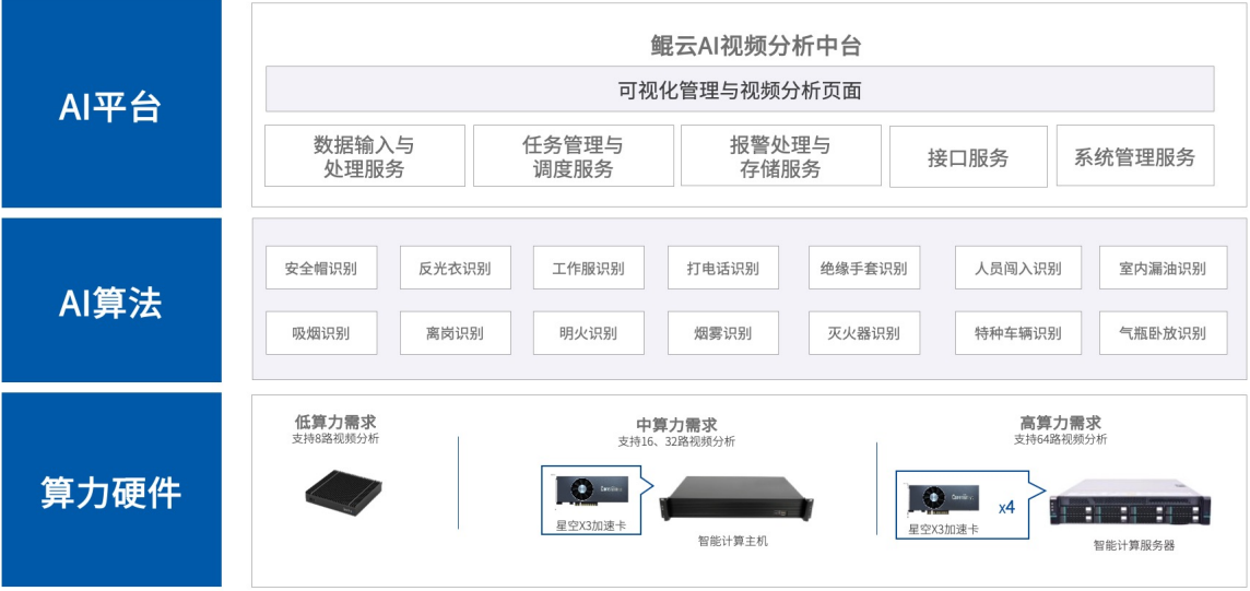 建設(shè)化工園區(qū)智能化管控平臺(tái),在給企業(yè)生產(chǎn)提質(zhì)增效的同時(shí),鯤云科技提供了利舊降本的建設(shè)方案。該方案通過將自主研發(fā)的AI邊緣計(jì)算盒子或AI服務(wù)器,可連接企業(yè)原有攝像頭,單臺(tái)設(shè)備支持8-64路視頻結(jié)構(gòu)化分析,并對安全風(fēng)險(xiǎn)信息實(shí)時(shí)預(yù)警推送至終端管理平臺(tái),給化工園區(qū)和危險(xiǎn)化學(xué)品企業(yè)提供了完善的智能化管控平臺(tái)。支持對液體泄露、煙霧火焰、未佩戴安全帽、未穿工服、人員離崗、打電話、人員睡崗、吸煙、人員闖入、人員摔倒等異常實(shí)時(shí)智能監(jiān)測報(bào)警,助力化工園區(qū)和危險(xiǎn)化學(xué)品企業(yè)有效實(shí)現(xiàn)企業(yè)安全風(fēng)險(xiǎn)管控?cái)?shù)字化轉(zhuǎn)型。