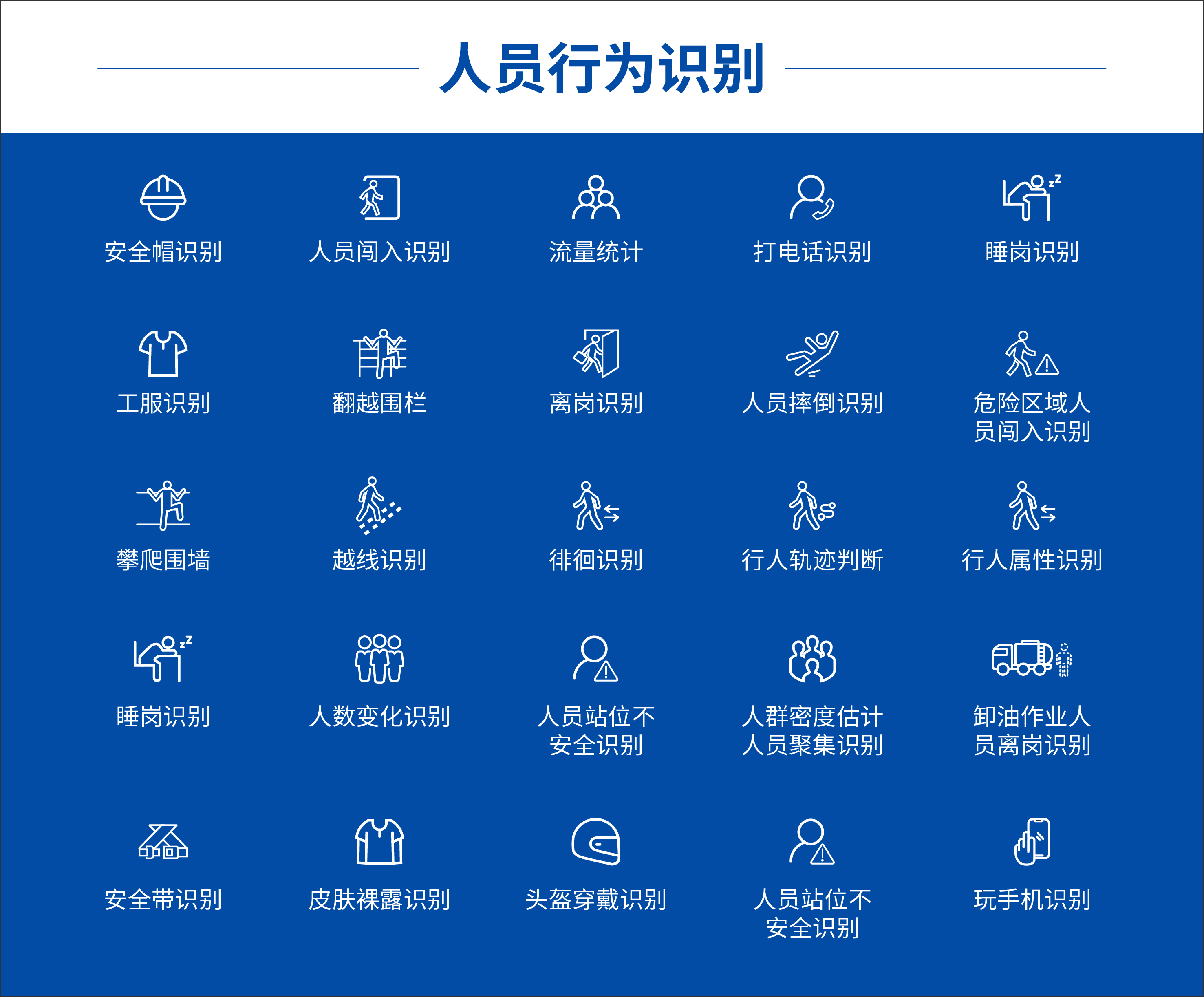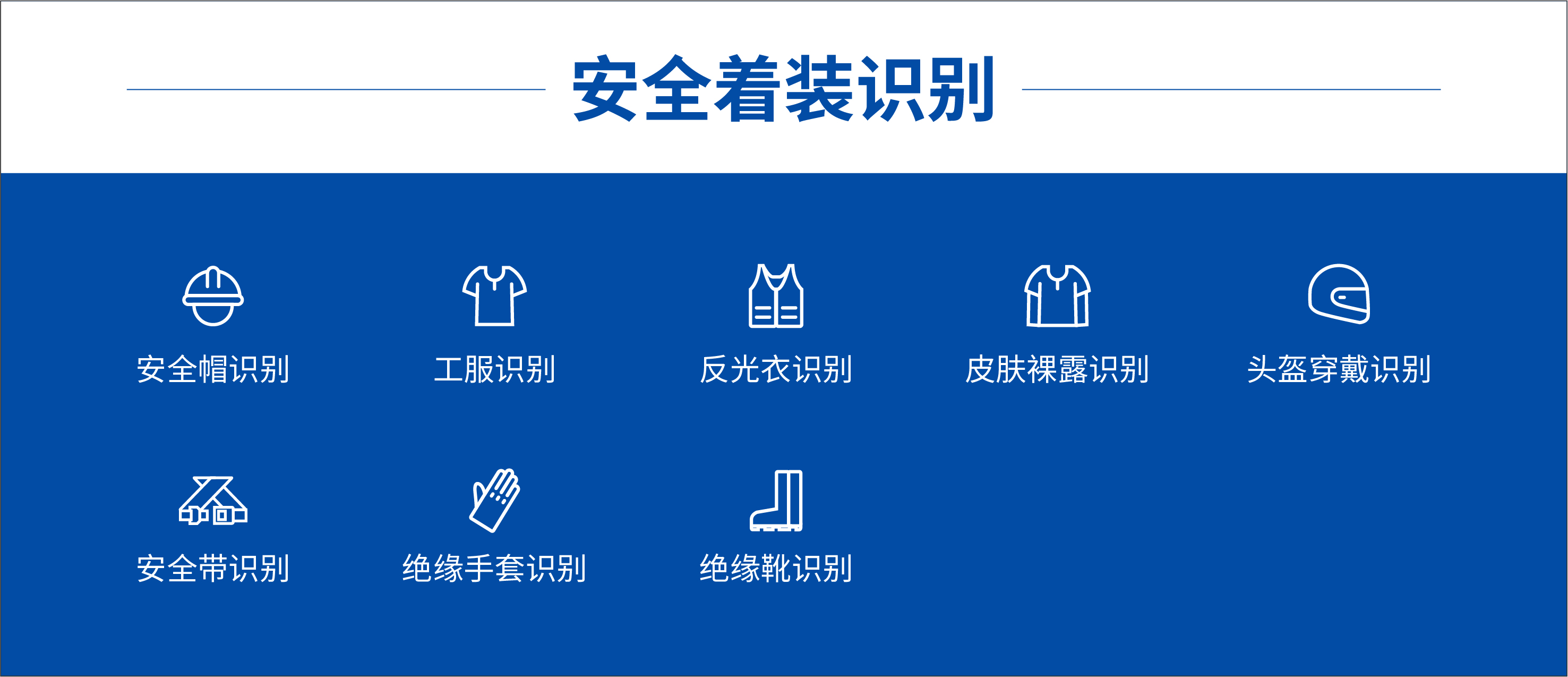 安全帽識別、工服識別、反光衣識別、皮膚裸露識別、安全帶識別等。