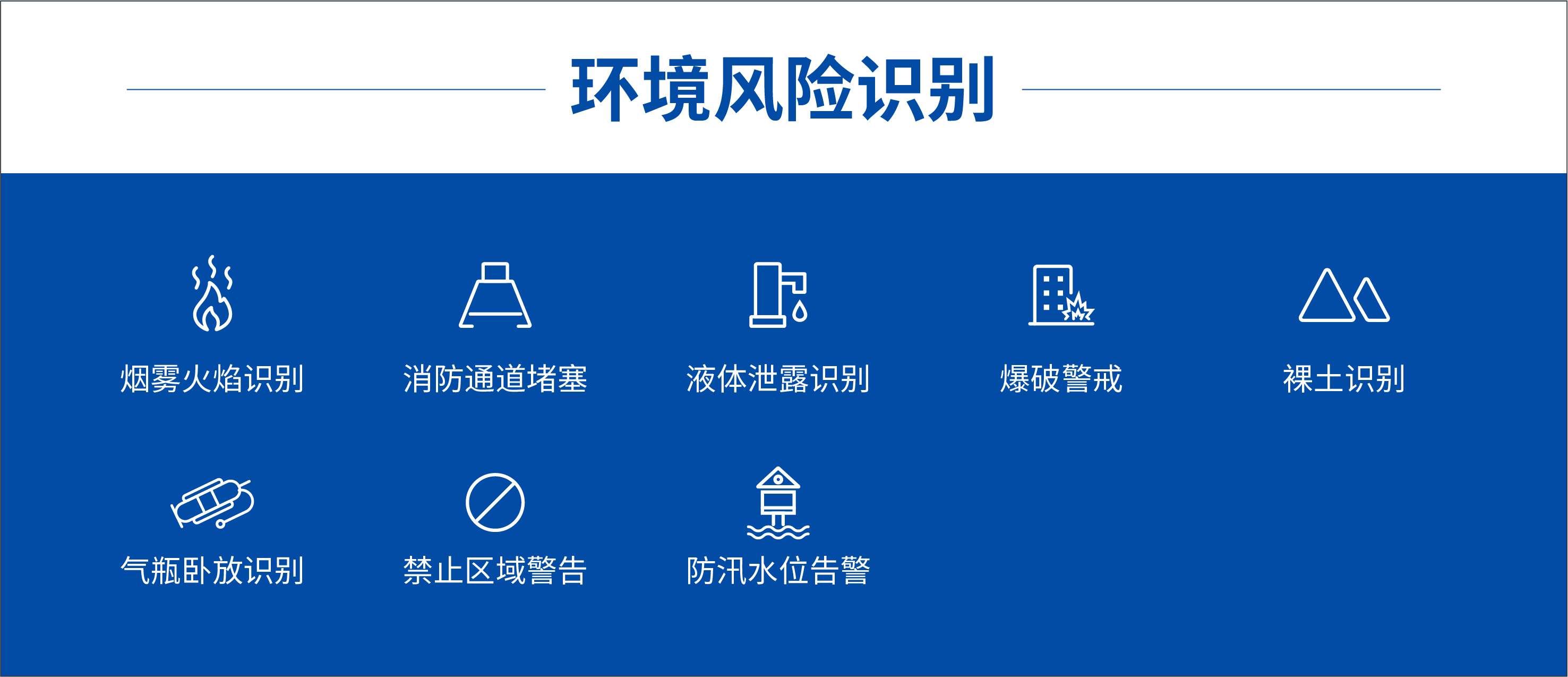 煙霧火焰識別、液體泄露識別、明火識別、裸土識別、車輛噴淋識別、桿塔倒伏識別、高壓隔離開關(guān)分合狀態(tài)識別、爆破警戒、消防通到堵塞、防汛水位告警等。