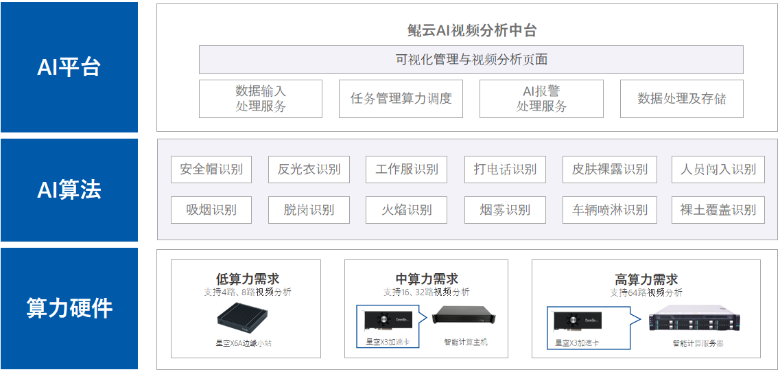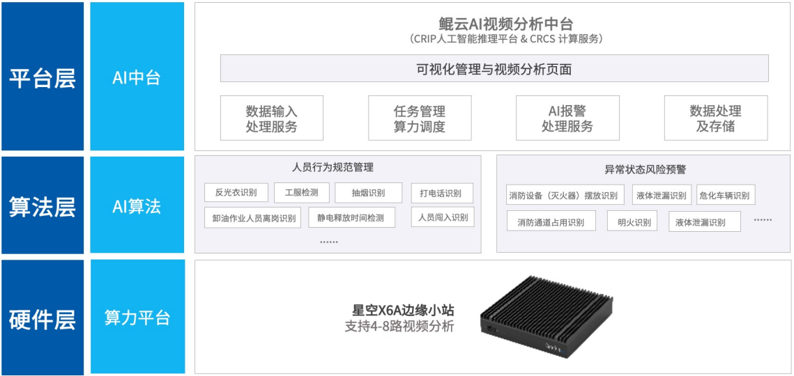 鯤云安全生產(chǎn)智能化系統(tǒng),遵循充分利舊降本的原則,部署具備ai智能分析算法的AI邊緣計(jì)算盒子或AI服務(wù)器,拉取企業(yè)工作場(chǎng)所各個(gè)關(guān)鍵位置的攝像頭數(shù)據(jù),應(yīng)用智能視頻識(shí)別技術(shù)對(duì)視頻畫(huà)面進(jìn)行分析,實(shí)現(xiàn)對(duì)安全生產(chǎn)環(huán)境的實(shí)時(shí)識(shí)別和預(yù)警,可以減少人力成本,提高監(jiān)管效率,同時(shí)更全面地監(jiān)測(cè)生產(chǎn)環(huán)境,有效避免了人的主觀因素所帶來(lái)的差錯(cuò),廣泛應(yīng)用于化工、加油站、建筑等多個(gè)領(lǐng)域,成為提升安全管理效率、保障工人安全的重要工具。