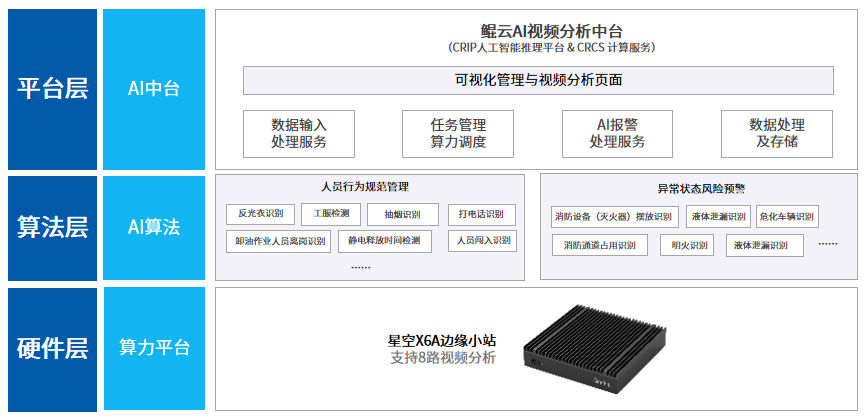 鯤云科技加油站AI智能檢測(cè)系統(tǒng),是通過1個(gè)邊緣盒子搭載7種AI算法連接加油站原有分析攝像頭,再將數(shù)據(jù)連通加油站AI分析中心,基于AI視頻分析技術(shù),打造出一套智能化加油站視頻分析系統(tǒng)??梢詫?shí)現(xiàn)對(duì)加油區(qū)和卸油區(qū)內(nèi)人員抽煙、打電話等違規(guī)行為,明火和煙霧等異常狀態(tài),卸油作業(yè)時(shí)人員離崗,滅火器未正確擺放,靜電釋放時(shí)間不足等不規(guī)范情形進(jìn)行24小時(shí)智能識(shí)別、語音報(bào)警和記錄,及時(shí)制止不安全行為。