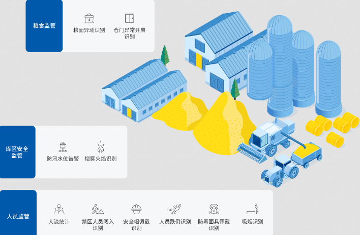 為加速AI在糧庫行業(yè)落地,鯤云科技推出智能化糧倉解決方案,基于人工智能技術(shù),依靠邊緣分析設(shè)備對糧倉攝像頭采集的視頻數(shù)據(jù)進(jìn)行實(shí)時(shí)識別分析,利用倉內(nèi)人數(shù)識別、倉門開關(guān)識別、糧面異動(dòng)識別、煙霧火焰識別等AI算法,實(shí)現(xiàn)可視化遠(yuǎn)程監(jiān)管、風(fēng)險(xiǎn)秒級預(yù)警、精準(zhǔn)化應(yīng)急調(diào)控,助力“科技儲(chǔ)糧、綠色儲(chǔ)糧、安全儲(chǔ)糧”,將糧食安全真正落到實(shí)處。
