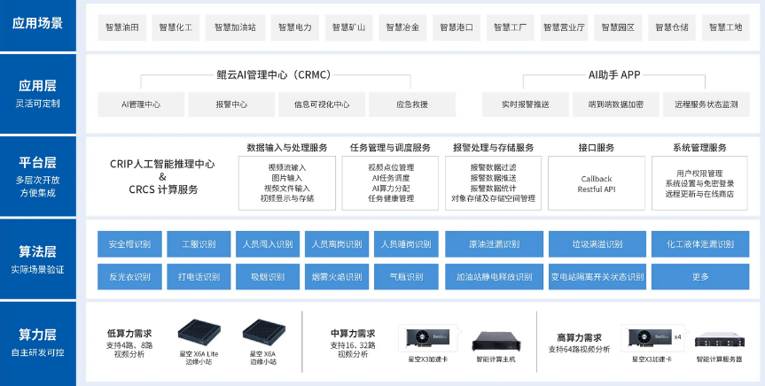 目前鯤云智能AI安防方案的應(yīng)用場(chǎng)景包括智慧化工、智慧礦山、智慧工地、智慧加油站、智慧糧庫(kù)、智慧社區(qū)等高危領(lǐng)域。針對(duì)不同行業(yè),鯤云科技按照不同行業(yè)的安全風(fēng)險(xiǎn)的特點(diǎn)和企業(yè)實(shí)際需求,提供了不同配置的AI邊緣盒子和AI邊緣服務(wù)器,通過(guò)部署安全帽識(shí)別、抽煙識(shí)別、煙霧火焰識(shí)別、工服識(shí)別等通用算法和行業(yè)定制化算法,利用AI視頻分析技術(shù)賦能傳統(tǒng)安防,在安全生產(chǎn)管理上成功幫助1000+企業(yè)減少了99%的安全事故發(fā)生率,減少了47%的人工成本,管理效率直線提升56%。