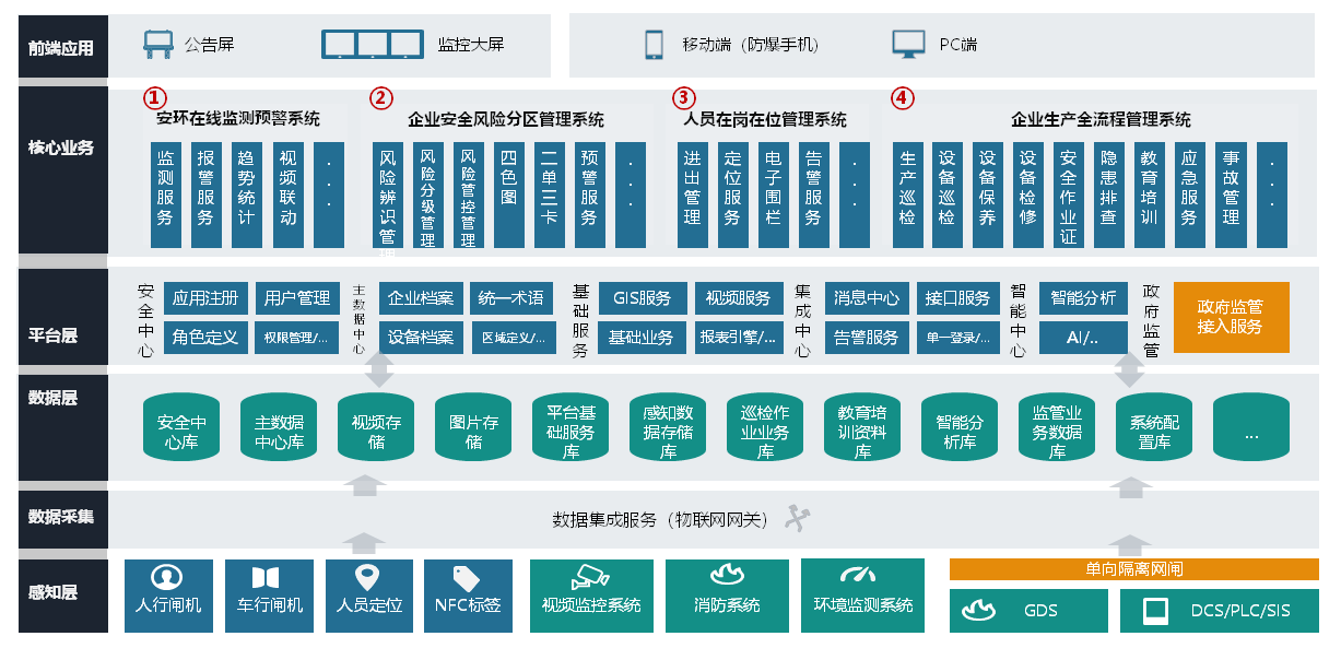 圍繞“安全生產(chǎn)標準化管理”體系建設(shè),利用人工智能技術(shù)、GIS技術(shù)、人員定位、物聯(lián)網(wǎng)監(jiān)測、視頻聯(lián)動等技術(shù),構(gòu)建風險分級管控與隱患排查治理雙重預(yù)防體系,提供重大危險源監(jiān)測預(yù)警、企業(yè)安全風險分區(qū)管理、企業(yè)生產(chǎn)流程管理、人員在崗在位管理等功能,從感知層、數(shù)據(jù)層、平臺層全面覆蓋工業(yè)企業(yè)安全生產(chǎn)相關(guān)業(yè)務(wù),提高企業(yè)安全生產(chǎn)管理水平。