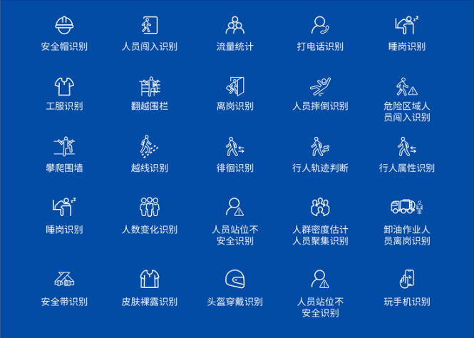 任何一個異常行為都有可能引發(fā)安全事故,為企業(yè)安全生產(chǎn)能夠得到保障,盡可能地將危險風(fēng)險控制為零。鯤云科技提供了多種自主研發(fā)的行為識別算法:抽煙識別、打電話識別、人員闖入識別、安全帽識別、工衣工服識別、人員睡崗識別、周界入侵、人員離崗識別、玩手機識別、未戴口罩識別、人員摔倒識別等人員行為分析算法,助力企業(yè)在人員行為安監(jiān)工作上成功減員降本,實現(xiàn)全方位智能化識別。