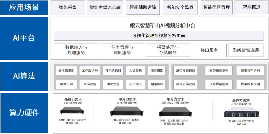 為加強(qiáng)礦山安全監(jiān)察能力,鯤云礦區(qū)安全識(shí)別系統(tǒng)基于人工智能視覺(jué)技術(shù),通過(guò)AI智能分析識(shí)別生產(chǎn)過(guò)程人機(jī)混合作業(yè)、三違作業(yè)管理、主煤流運(yùn)輸與輔助運(yùn)輸管理、皮帶機(jī)設(shè)備異常狀態(tài)等風(fēng)險(xiǎn),實(shí)時(shí)對(duì)地面和井下關(guān)鍵點(diǎn)位進(jìn)行監(jiān)測(cè)預(yù)警,助力礦業(yè)企業(yè)向智能化礦山轉(zhuǎn)型升級(jí)。