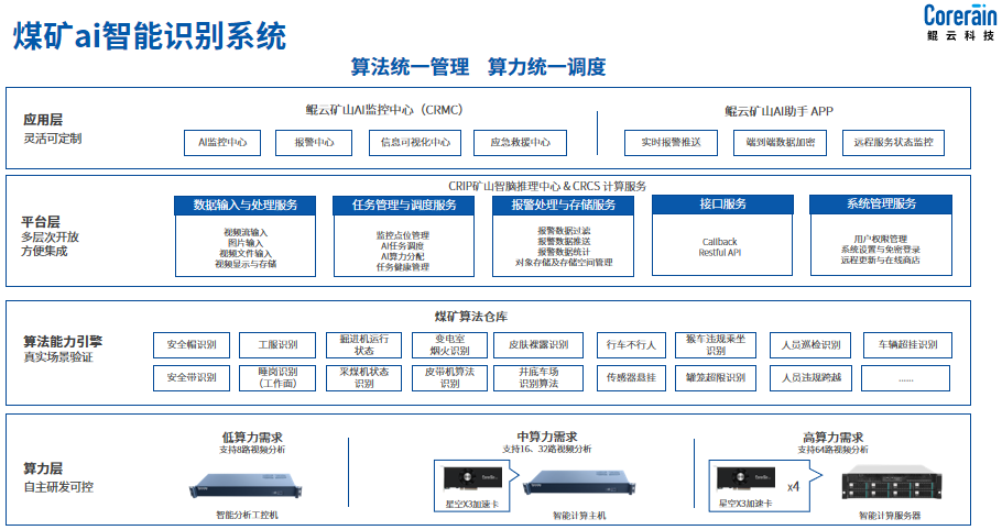 為實(shí)現(xiàn)對(duì)煤礦及重點(diǎn)非煤礦山關(guān)鍵地點(diǎn)、重點(diǎn)部位重大風(fēng)險(xiǎn)的實(shí)時(shí)監(jiān)測(cè)、及時(shí)識(shí)別和精準(zhǔn)研判,鯤云科技按照礦山智能化要求,給煤礦提供了煤礦視頻AI解決方案,通過對(duì)視頻圖像的識(shí)別和分析,識(shí)別生產(chǎn)過程人機(jī)混合作業(yè)、三違作業(yè)管理、主煤流運(yùn)輸與輔助運(yùn)輸管理、皮帶機(jī)設(shè)備異常狀態(tài)等風(fēng)險(xiǎn),實(shí)時(shí)對(duì)地面和井下關(guān)鍵點(diǎn)位進(jìn)行監(jiān)測(cè)預(yù)警,助力礦業(yè)企業(yè)向智能化礦山轉(zhuǎn)型升級(jí)。