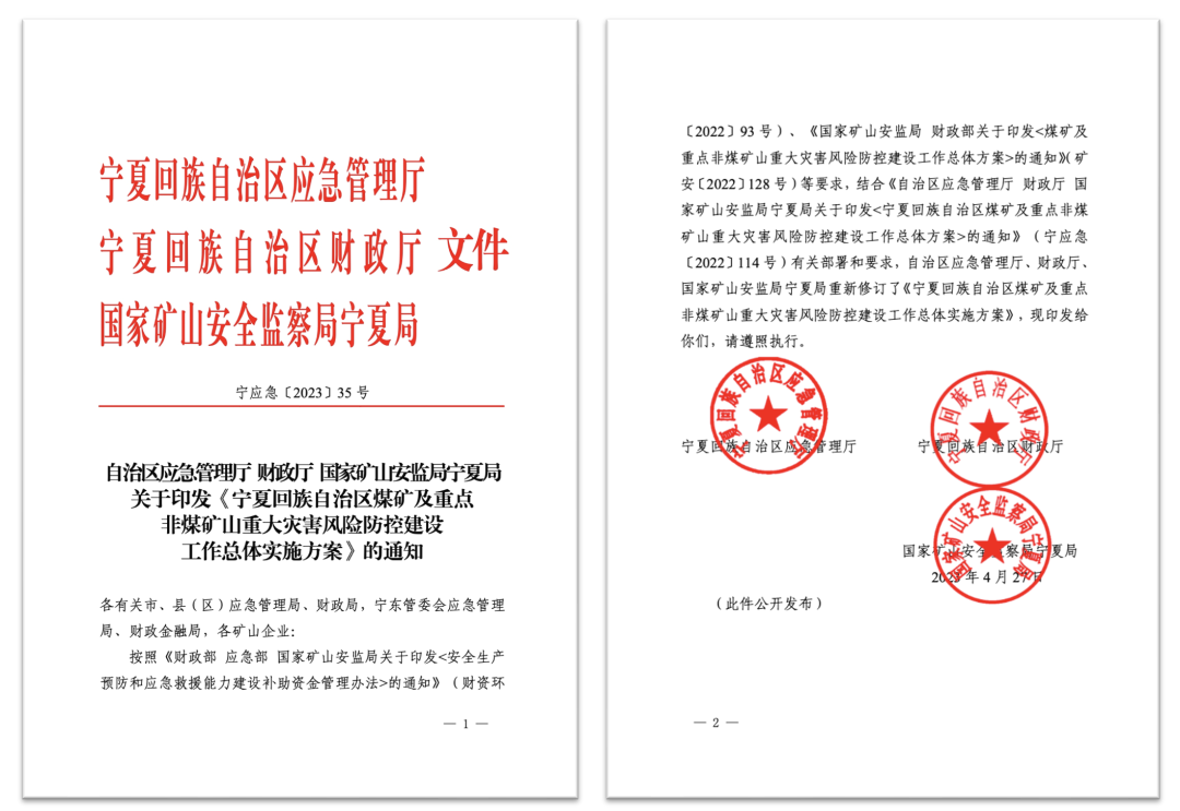 其中,寧夏回族自治區(qū)應(yīng)急管理廳、財(cái)政廳、 國(guó)家礦山安監(jiān)局寧夏局重新修訂了《寧夏回族自治區(qū)煤礦及重點(diǎn)非煤礦山重大災(zāi)害風(fēng)險(xiǎn)防控建設(shè)工作總體實(shí)施方案》。
