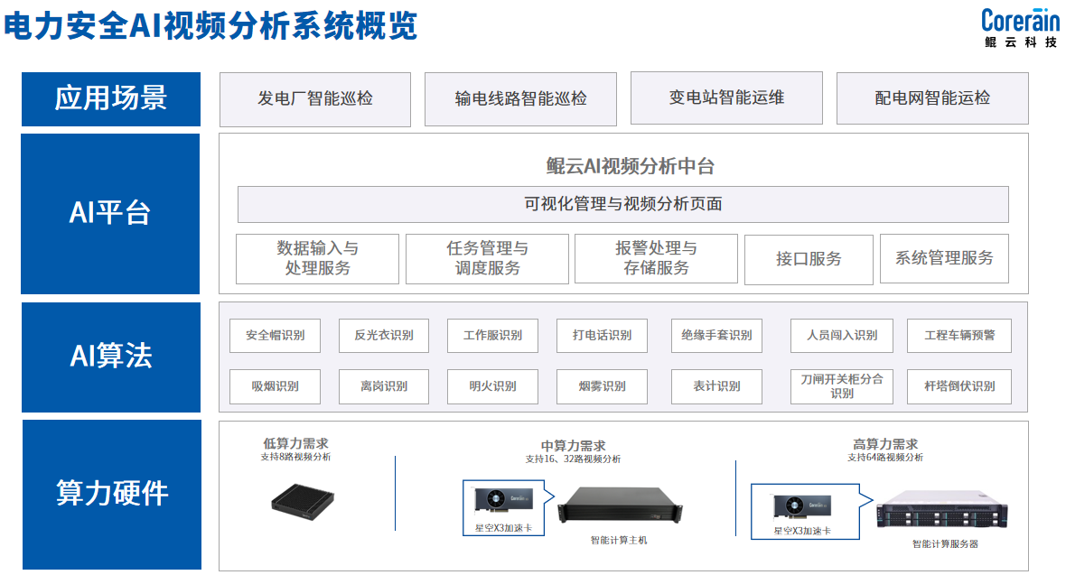 針對(duì)發(fā)電、輸電、變電、配電等關(guān)鍵電力行業(yè)場景,鯤云科技提供算力算法平臺(tái)一體化智慧電力系統(tǒng),智慧電力系統(tǒng)將傳統(tǒng)電力運(yùn)維系統(tǒng)與人工智能技術(shù)深度融合,利用安全帽識(shí)別、反光衣識(shí)別、絕緣手套識(shí)別、離崗識(shí)別、明火識(shí)別、煙霧識(shí)別、刀閘開關(guān)柜分合識(shí)別、桿塔倒伏識(shí)別等AI算法,對(duì)電力工程現(xiàn)場進(jìn)行全面、實(shí)時(shí)監(jiān)測(cè),及時(shí)發(fā)現(xiàn)安全隱患,當(dāng)監(jiān)測(cè)到違規(guī)操作或其他安全隱患時(shí),系統(tǒng)會(huì)自動(dòng)發(fā)出報(bào)警信號(hào),提醒相關(guān)人員進(jìn)行處理,防止事故的發(fā)生。