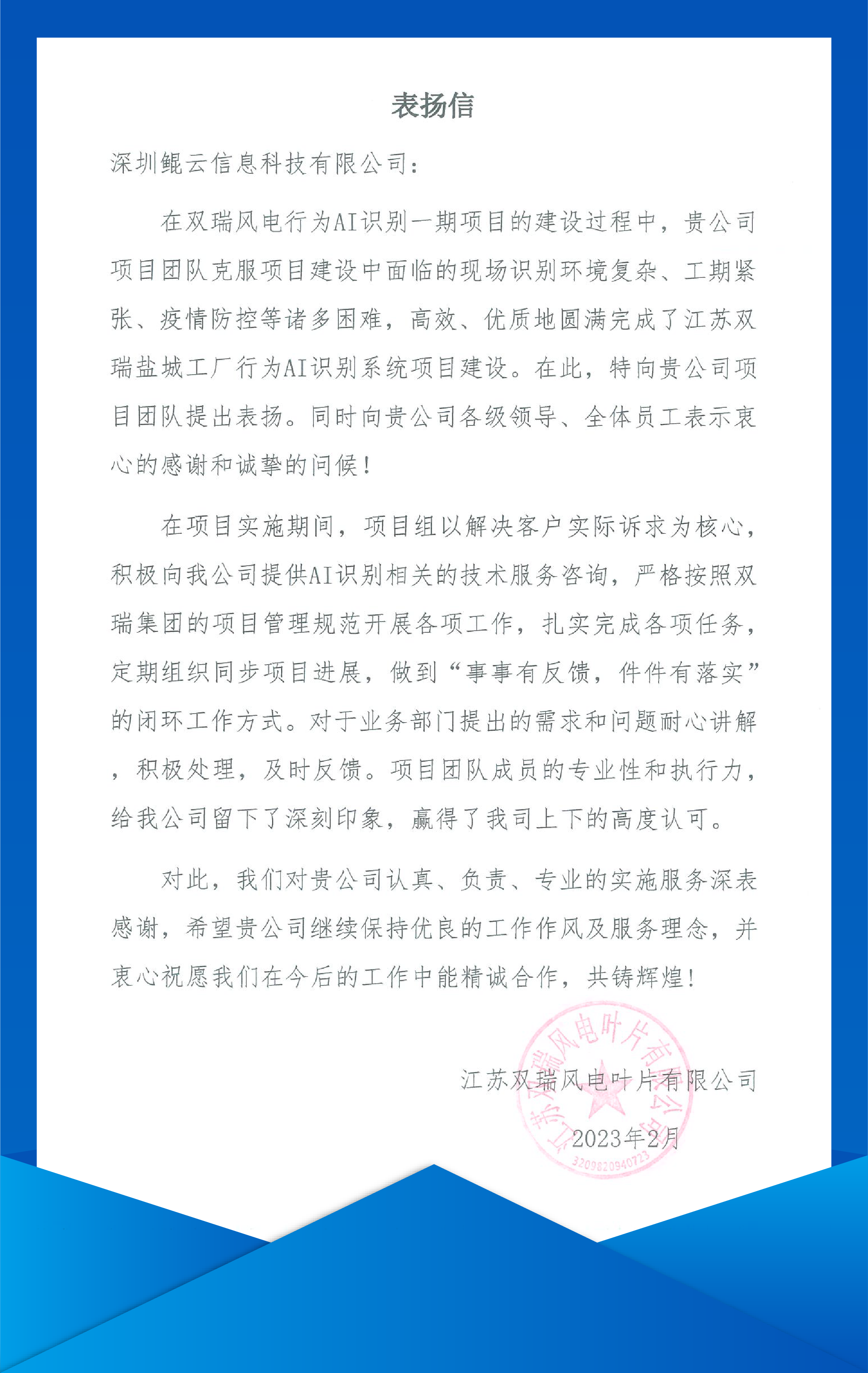 本次項(xiàng)目建設(shè)過程中,鯤云團(tuán)隊(duì)面臨識別環(huán)境復(fù)雜、工期緊張、疫情防控等諸多困難,仍然高效、優(yōu)質(zhì)地圓滿完成江蘇雙瑞鹽城工廠行為AI識別系統(tǒng)項(xiàng)目建設(shè),收到了來自雙瑞風(fēng)電的實(shí)名點(diǎn)贊。