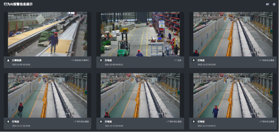 一期試點(diǎn)項(xiàng)目確認(rèn)在鹽城基地的成型車間、后處理車間、倉儲(chǔ)物流車間、化學(xué)品庫、危廢庫、垃圾場等場景根據(jù)管理需求部署未佩戴安全帽識別、未佩戴防塵口罩、打電話識別、攀爬欄桿作業(yè)識別、吊物作業(yè)下停留、煙火識別等鯤云通用AI算法。
