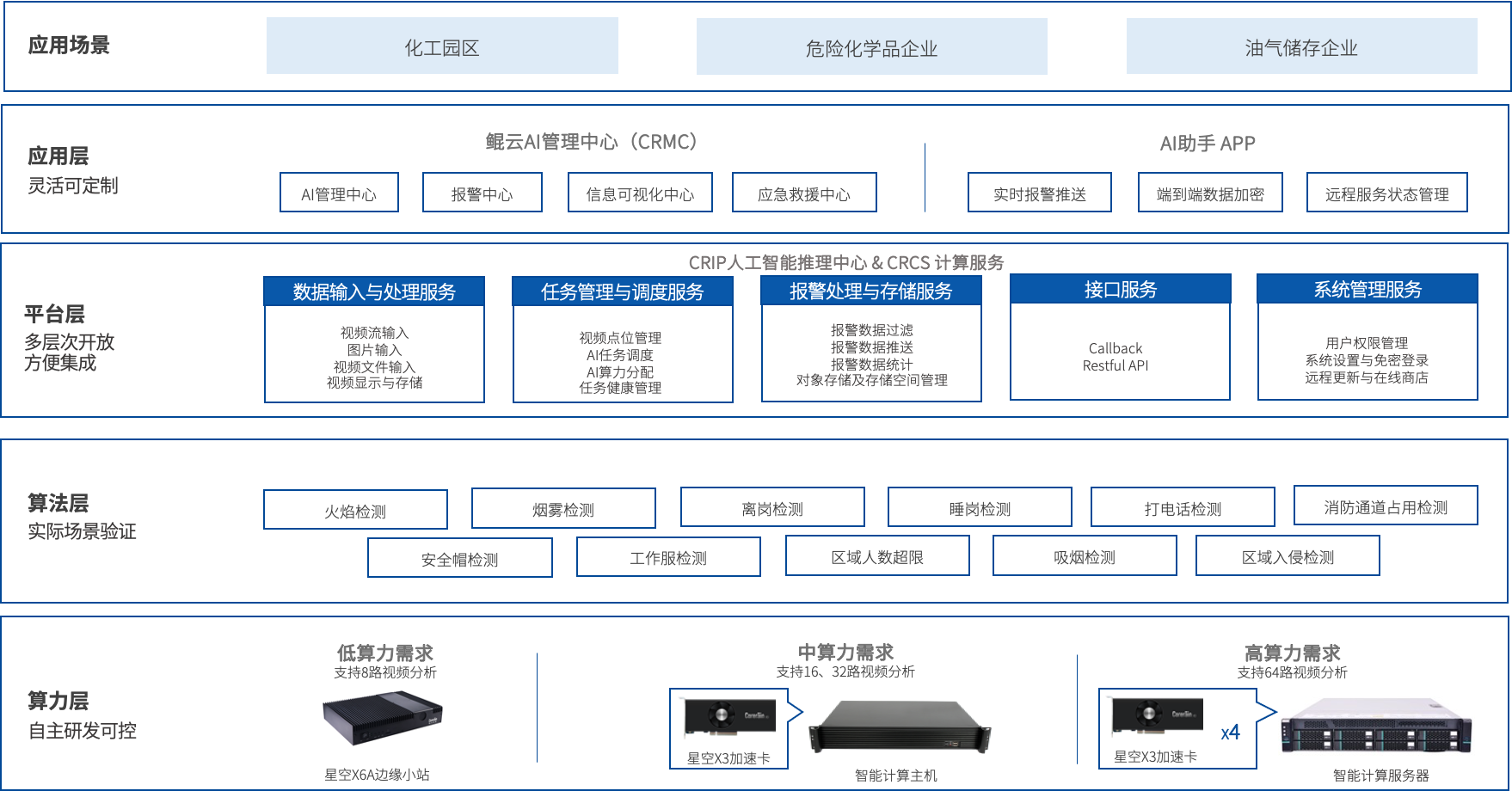 針對化工行業(yè)安全管控效率及成本等問題,鯤云推出軟硬件一體化的AI視頻分析解決方案,包括成熟的高精度行業(yè)算法及自主研發(fā)的高性能 AI 算力產(chǎn)品,支持生產(chǎn)現(xiàn)場人員行為、環(huán)境安全、生產(chǎn)設備狀態(tài)的實時監(jiān)測與識別報警。